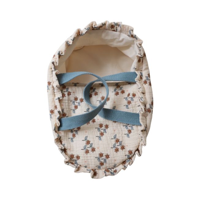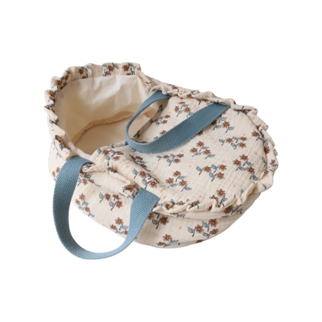 Recouvert du délicat motif fleuri bleu et écru inspiré des imprimés indiens de la collection À la cueillette. Léger et facile à transporter grâce à ses anses renforcées, il permet d’emmener sa poupée partout en toute sécurité.