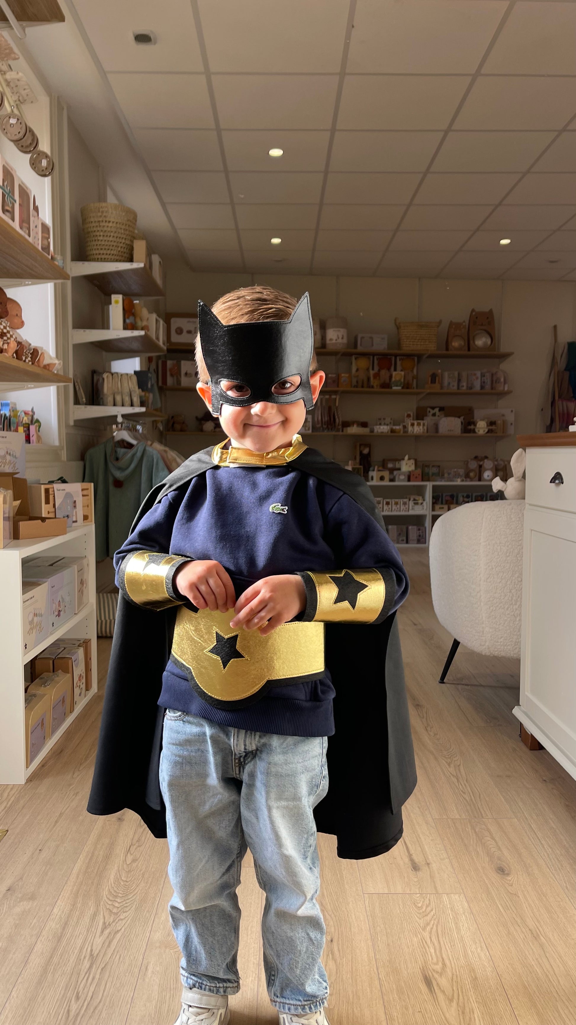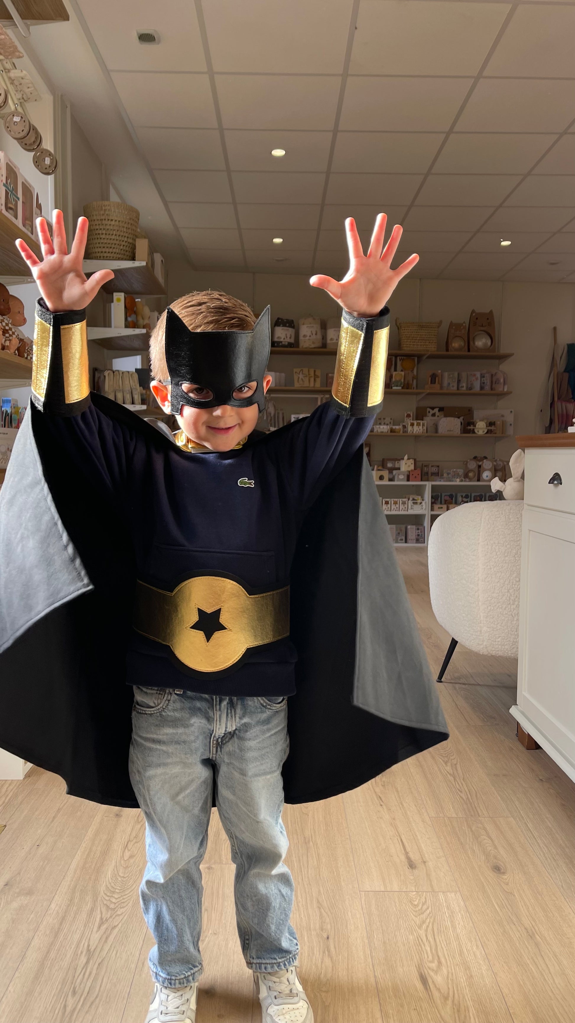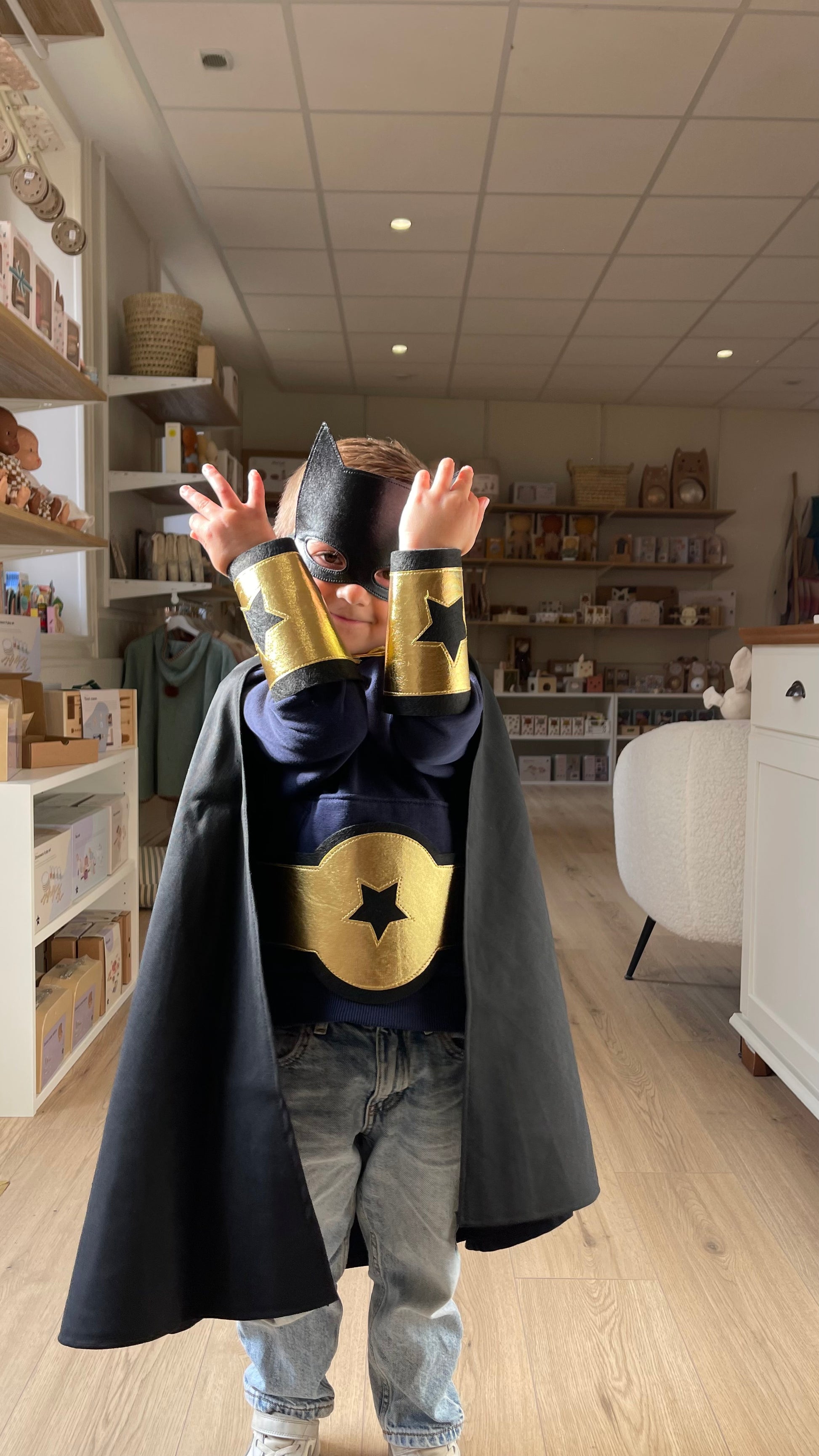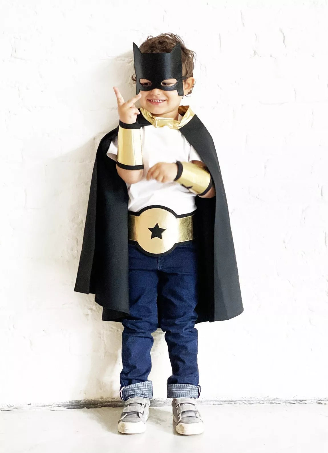 Ce kit de déguisement de super héros noir et doré de la marque Ratatam, est composé d'une cape de super héros (système patch velcro à l'encolure), de deux manchettes en feutrine fermeture patch velcro, d'un bouclier anti-méchants et d'un 1 masque de super héros élastique !