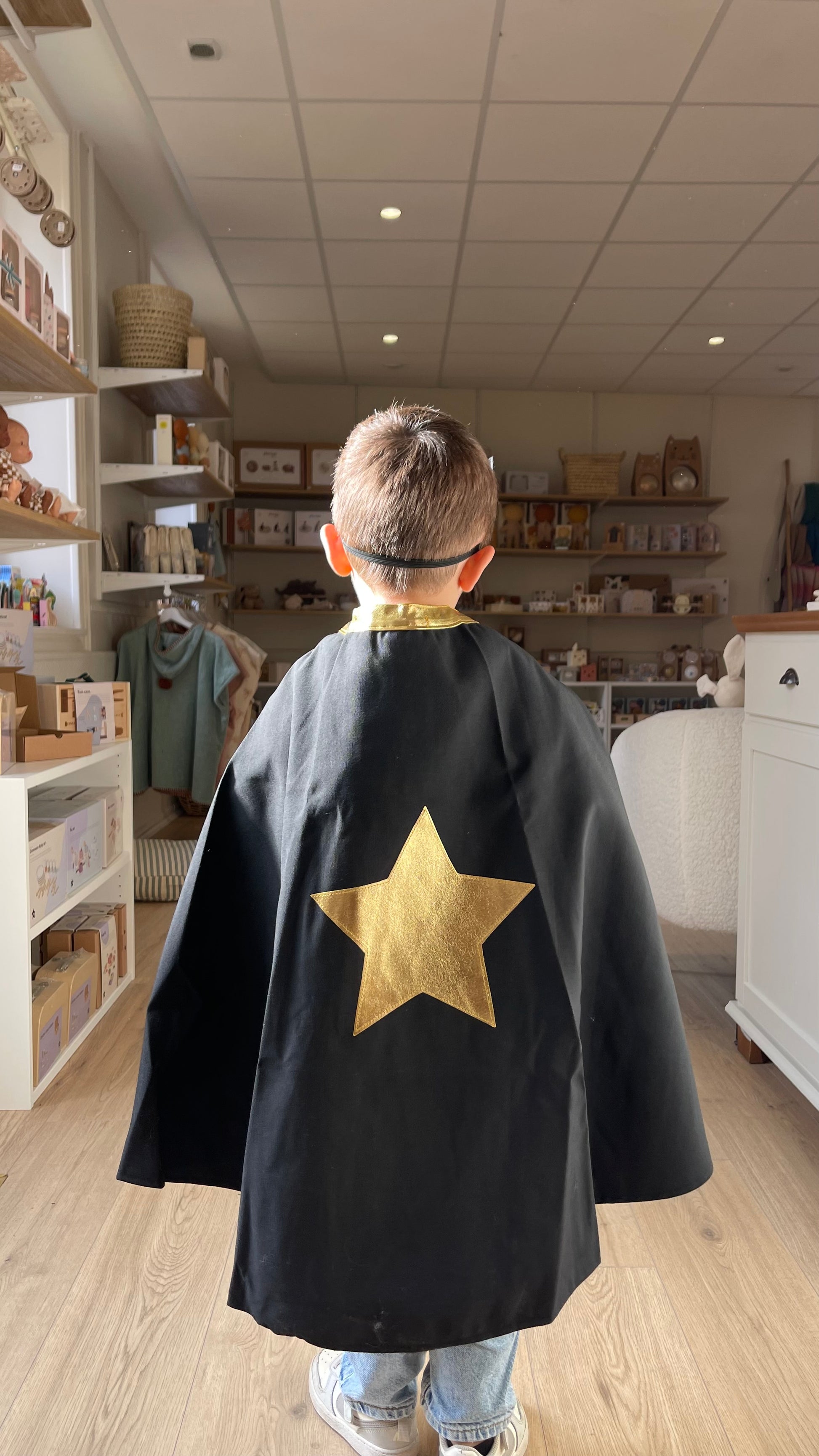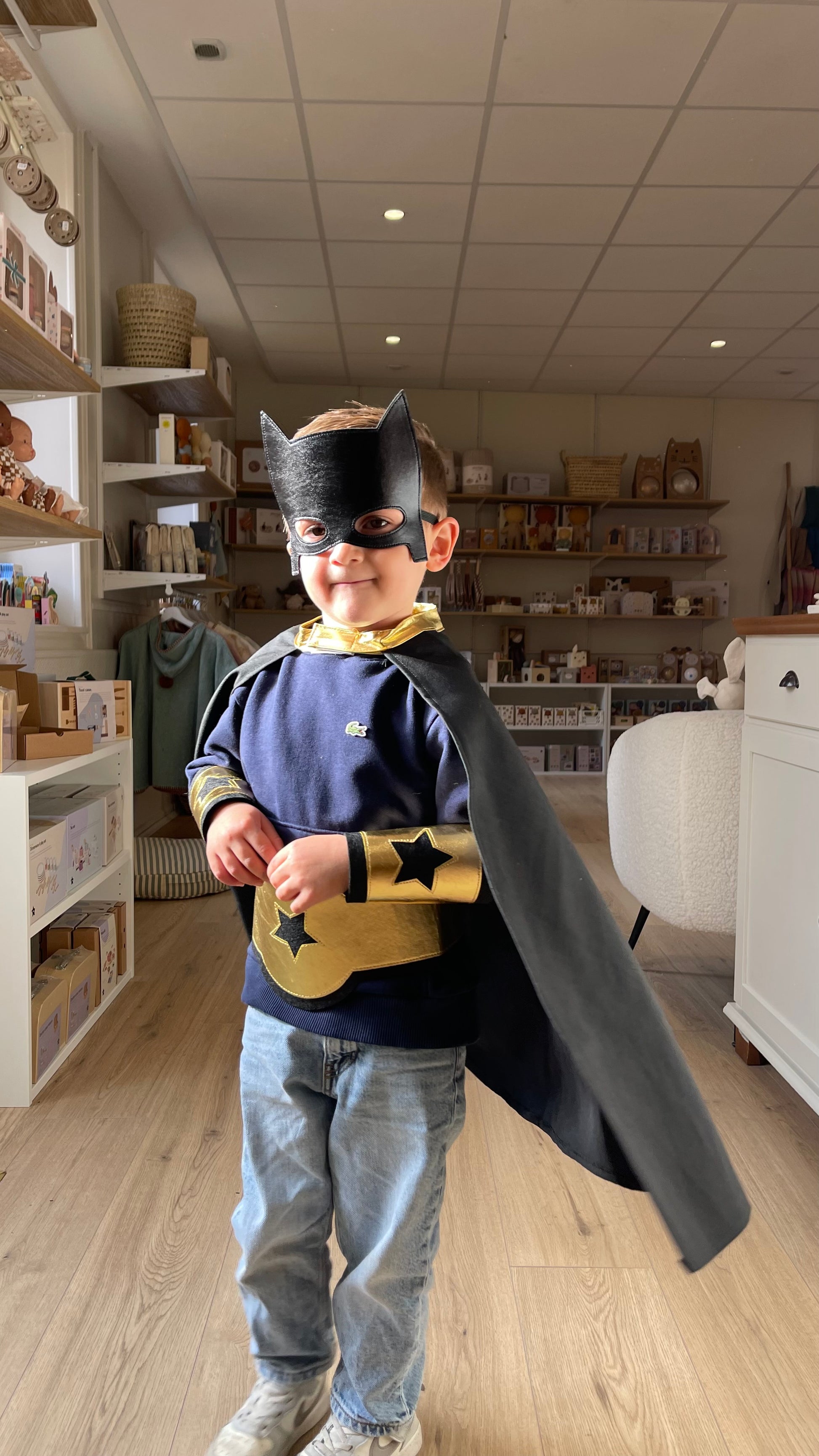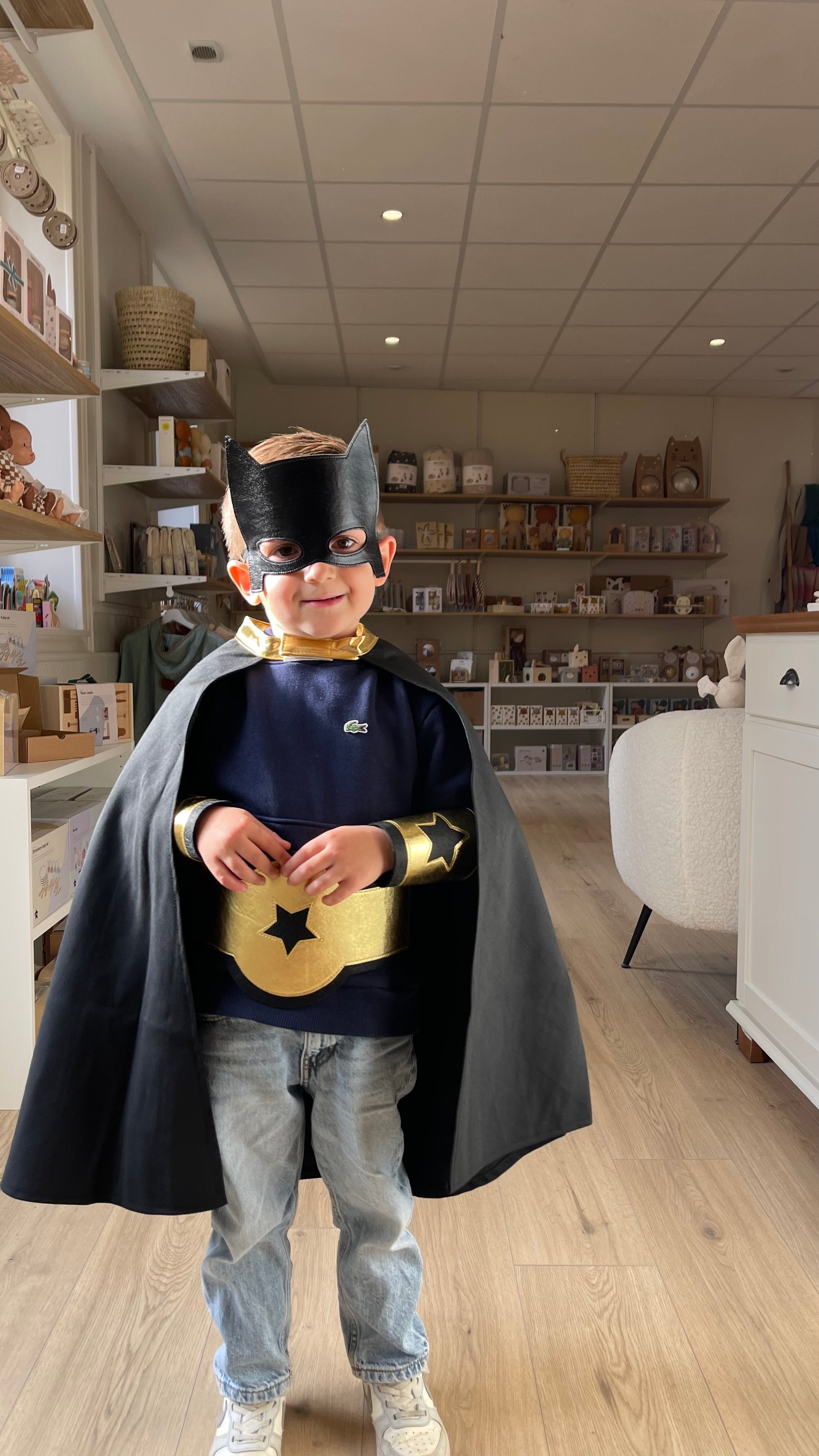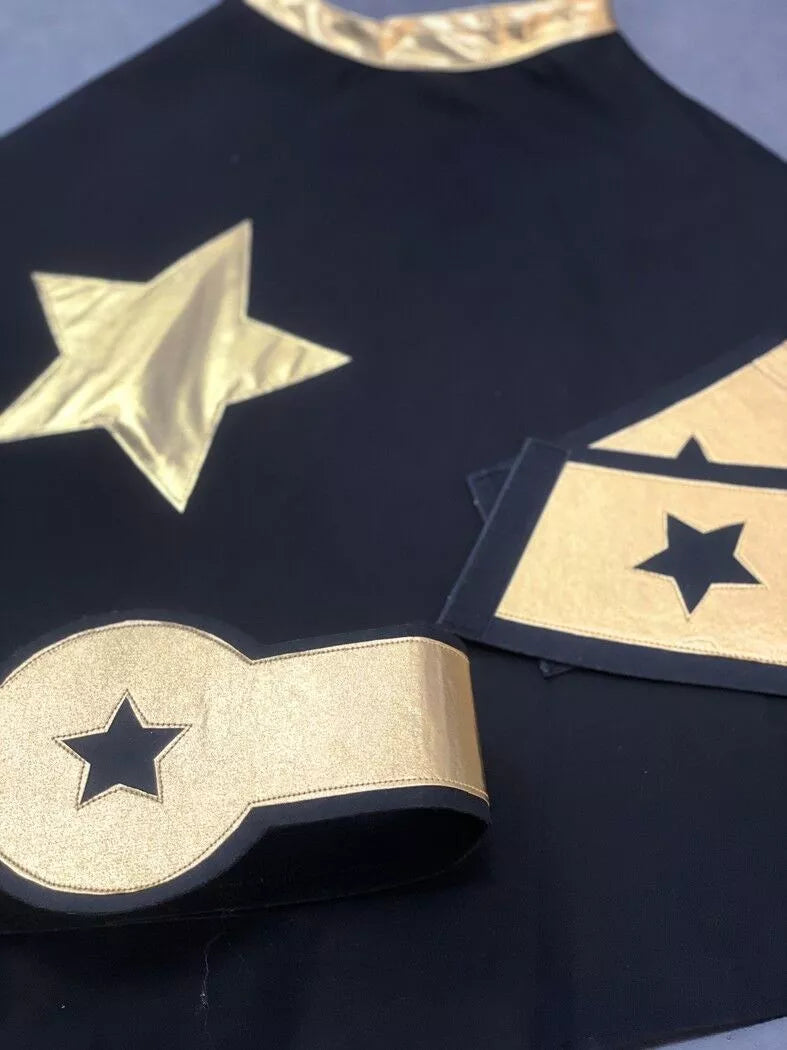 Ce kit de déguisement de super héros noir et doré de la marque Ratatam, est composé d'une cape de super héros (système patch velcro à l'encolure), de deux manchettes en feutrine fermeture patch velcro, d'un bouclier anti-méchants et d'un 1 masque de super héros élastique !