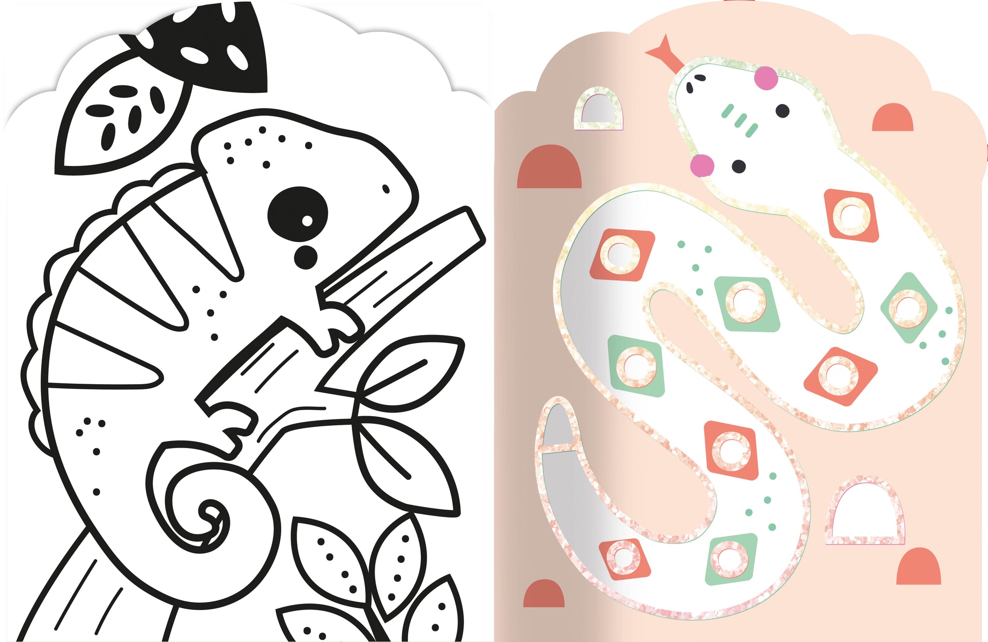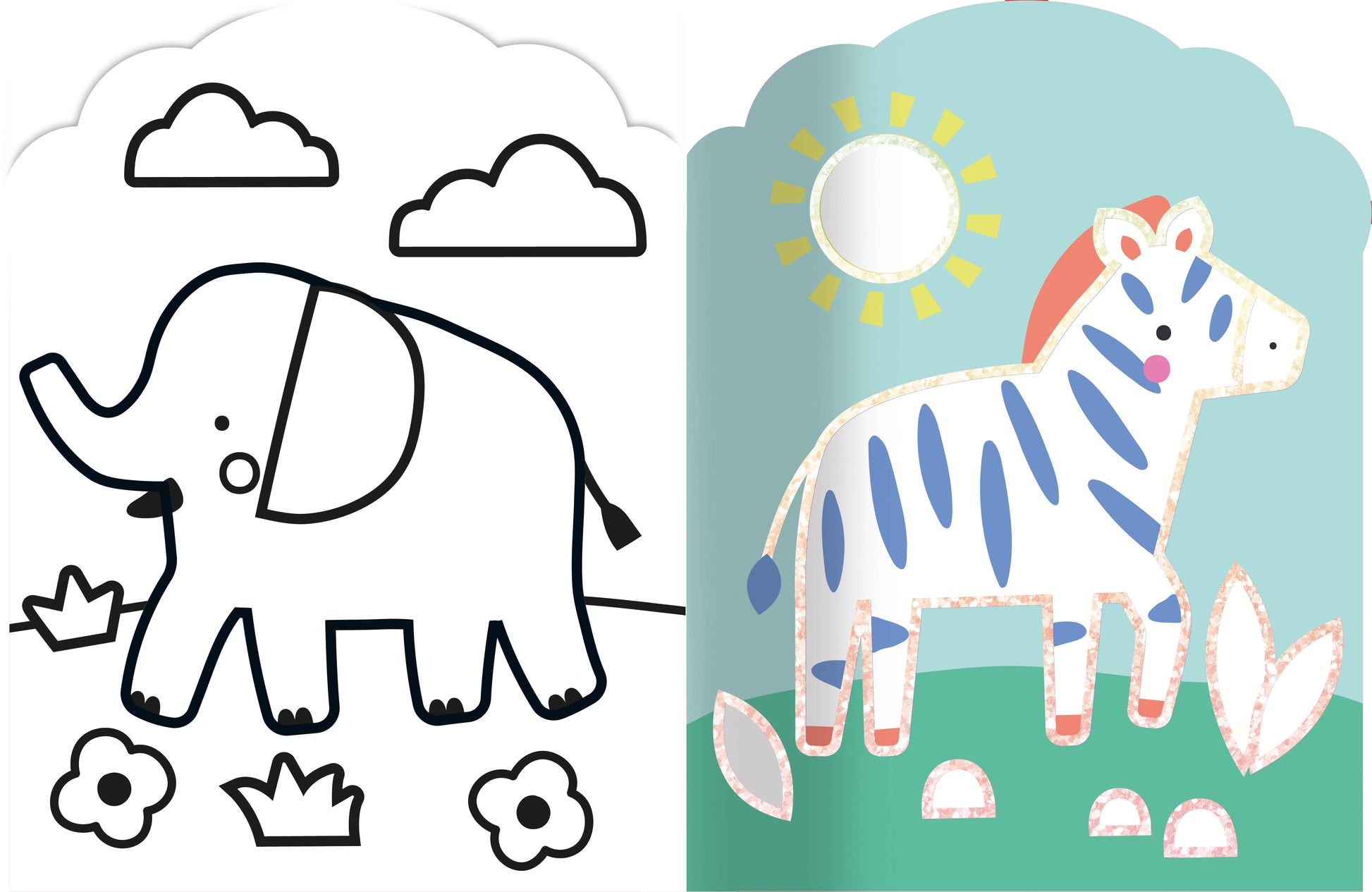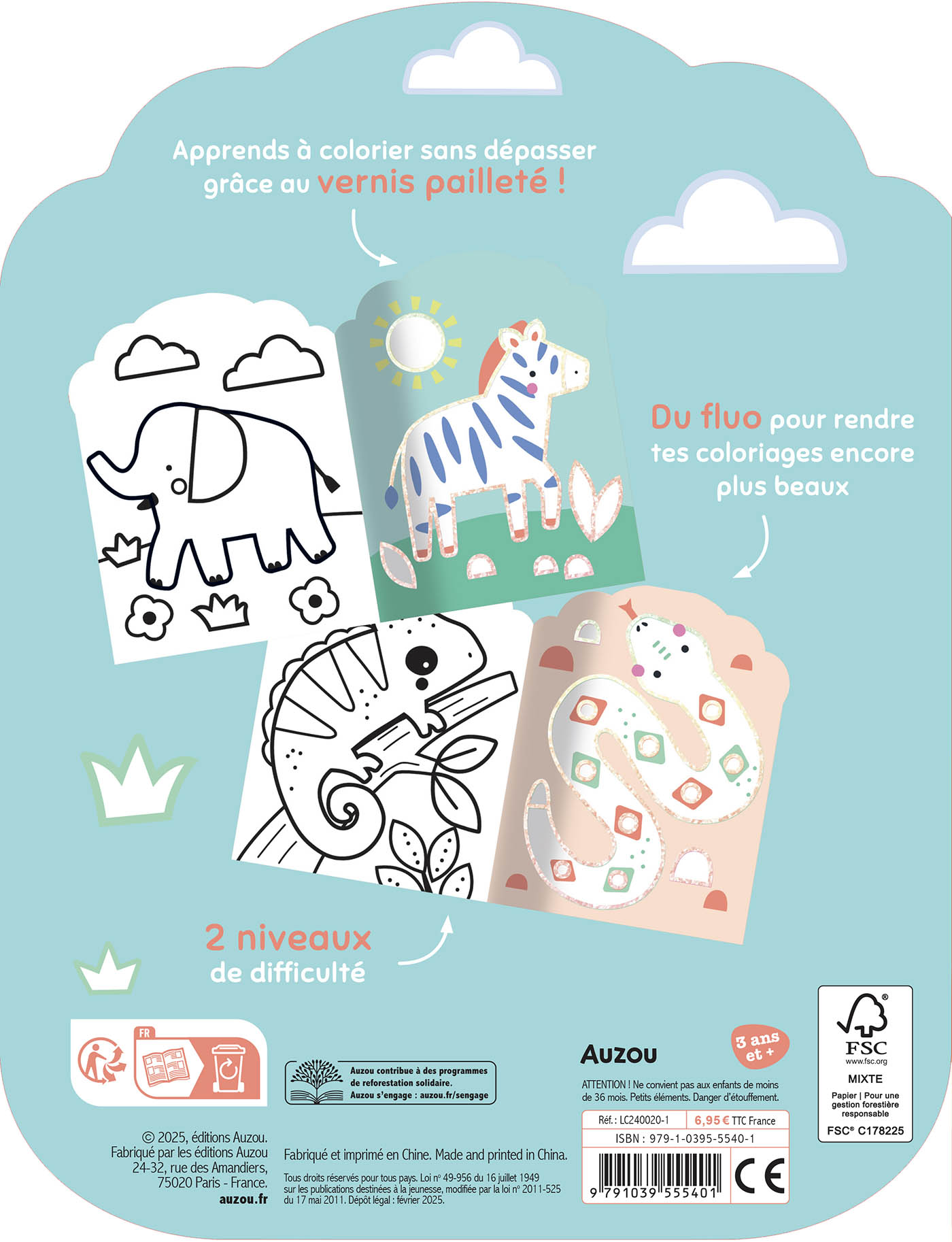 Découvre tes nouveaux coloriages fluos sur le thème de la savane avec deux niveaux de difficulté : le premier niveau pour apprendre à bien colorier sans dépasser avec l'aide du vernis à paillettes et le deuxième niveau sans vernis à paillettes pour montrer tes talents !