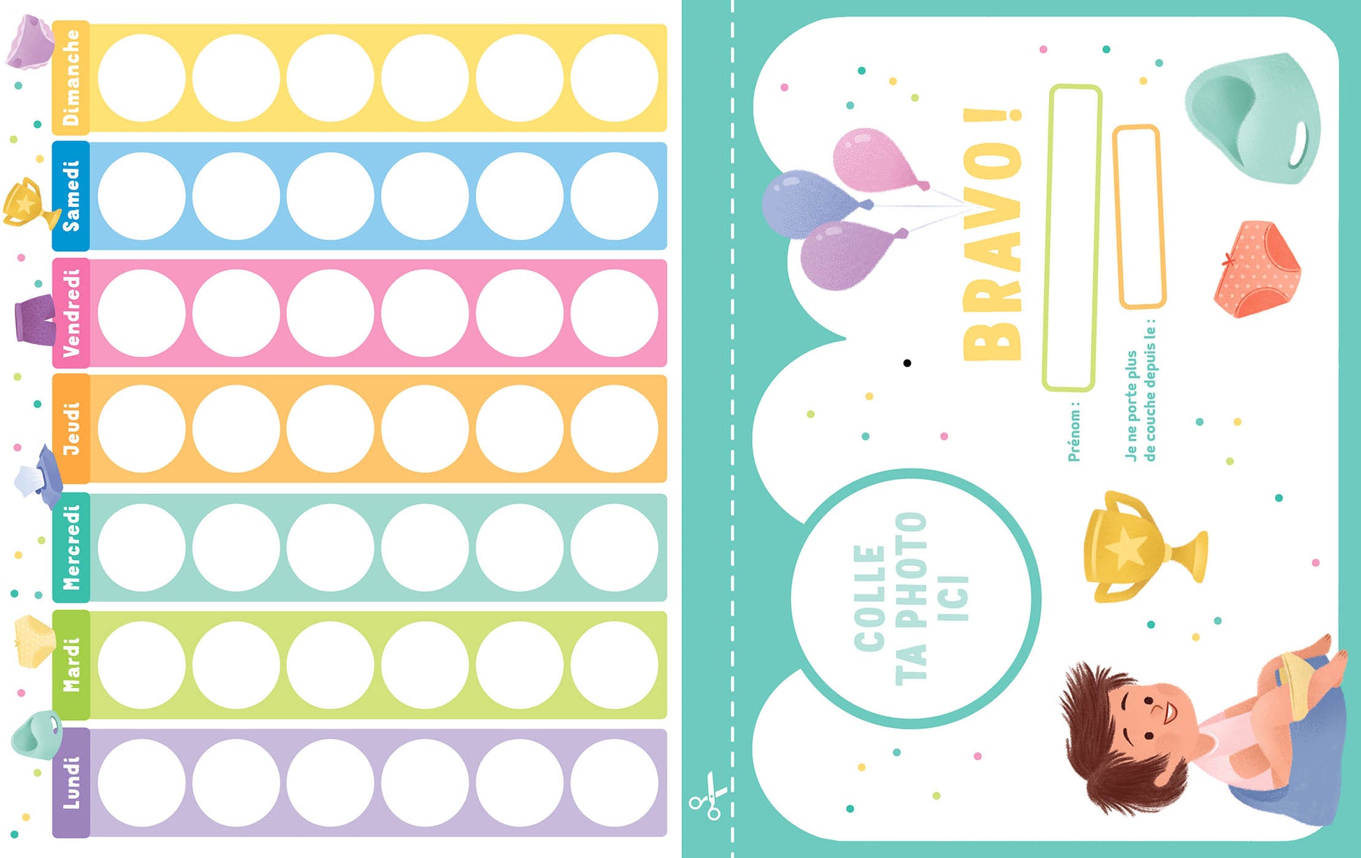 Un calendrier à remplir avec des autocollants pipi et caca pour aider et accompagner votre mini dans l'utilisation du pot. Une fois cette (grande) étape réussie un super diplôme complètent ce manuel prêt à l'emploi !