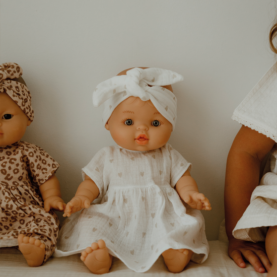 Une adorable tenue de poupée conçu par Atelier Wagram en gaze de coton, élastiquée aux pieds, au cou et aux poignets pour poupée 34cm.