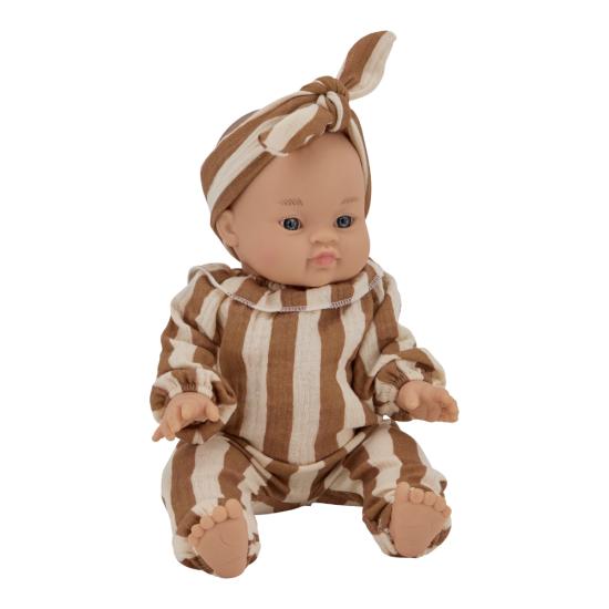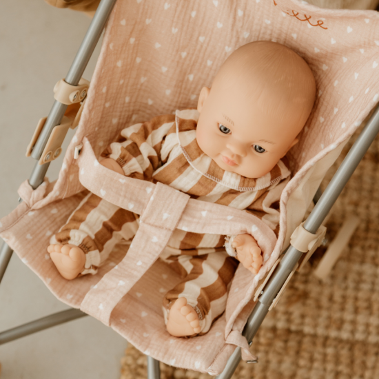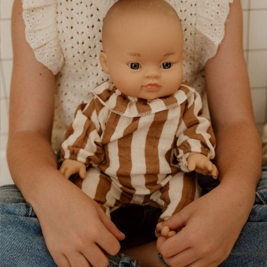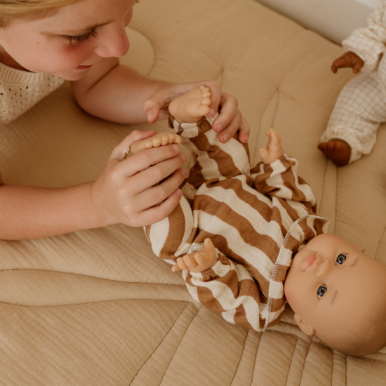 Une adorable tenue de poupée conçu par Atelier Wagram en gaze de coton, élastiquée aux pieds, au cou et aux poignets pour poupée 34cm.